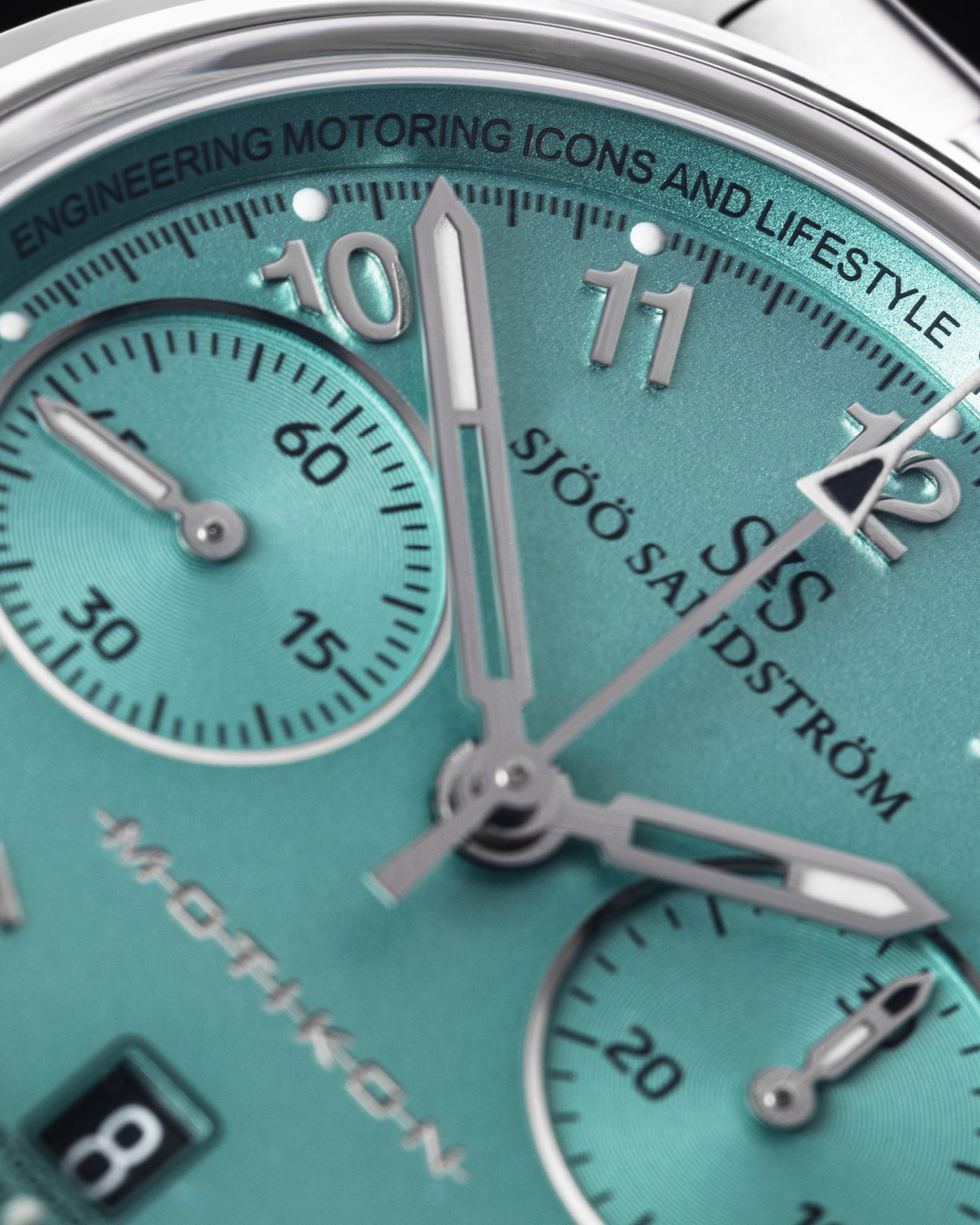 The collaboration has resulted in two new versions of the Royal Steel Chronograph 40mm, both featuring MOTIKON’s signature turquoise color, inspired by their logo. One version presents a monochrome dial where even the subdials are turquoise, while the other contrasts the iconic turquoise dial with black subdials for a bold, striking look. In both editions, the MOTIKON logo is subtly engraved on the dial. Between 9 and 12 o’clock, the tachymeter scale has been replaced with MOTIKON’s slogan: “Engineering motoring icons and lifestyle.” This design detail not only gives the watch a unique appearance but also highlights MOTIKON’s identity, a tribute to their philosophy of combining iconic engineering with lifestyle and passion.