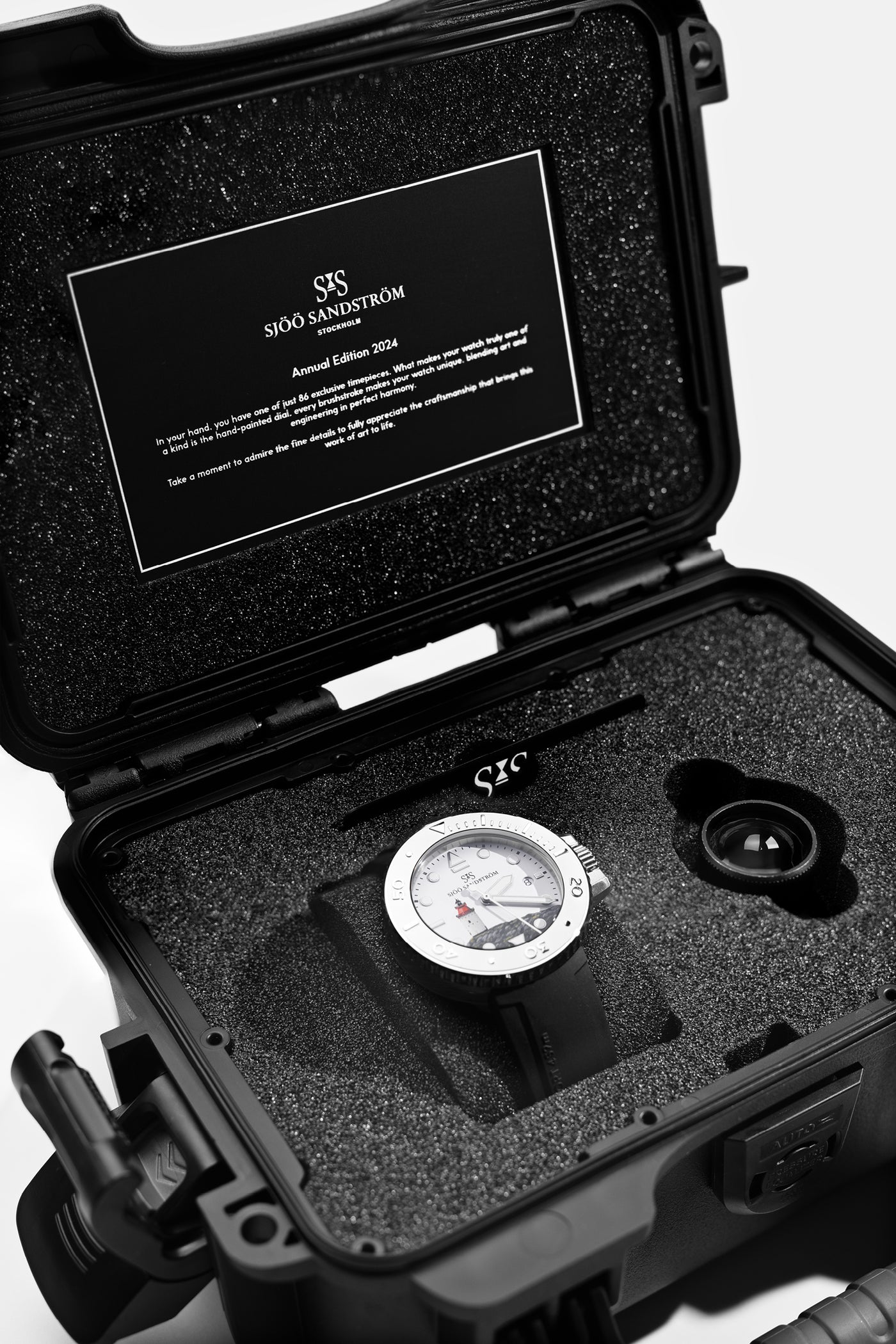 Das Zifferblatt ist vom ikonischen Leuchtturm von Landsort inspiriert und fängt den Geist der rauen Küste Schwedens ein. Es symbolisiert Stärke, Widerstandsfähigkeit und Führung. Diese auf nur 86 Stück limitierte Edition verbindet nahtlos Präzisionstechnik mit künstlerischem Ausdruck.
