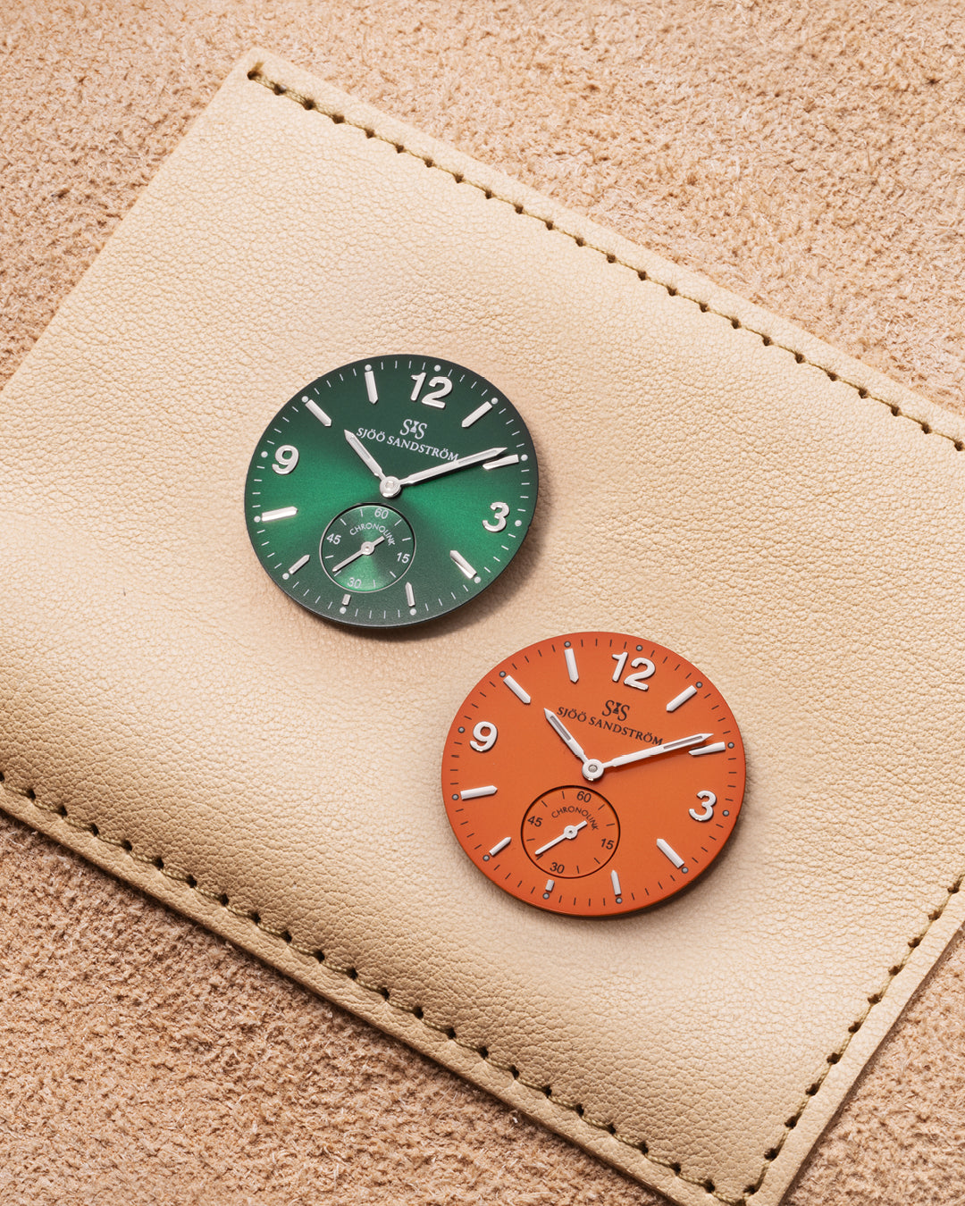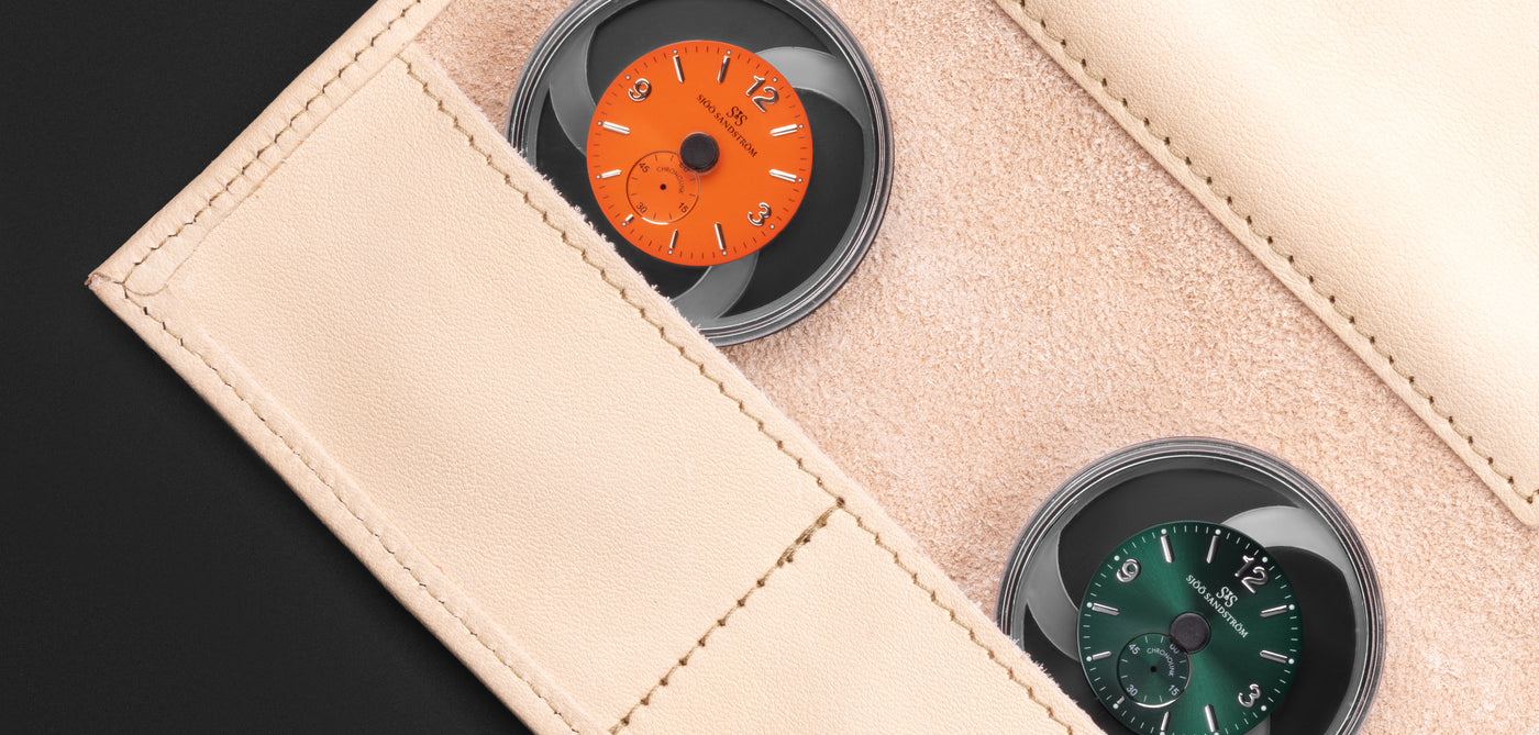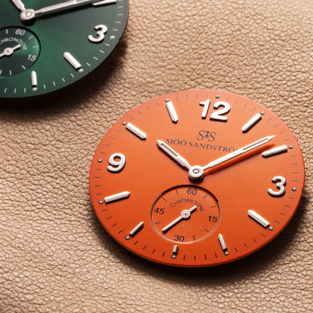 „ Vibrant“ enthält ein grünes und ein orangefarbenes Zifferblatt mit Stahlindex. Zwei Zifferblattwechsel sind gegen Vorlage des im Lederetui enthaltenen Scheines möglich.